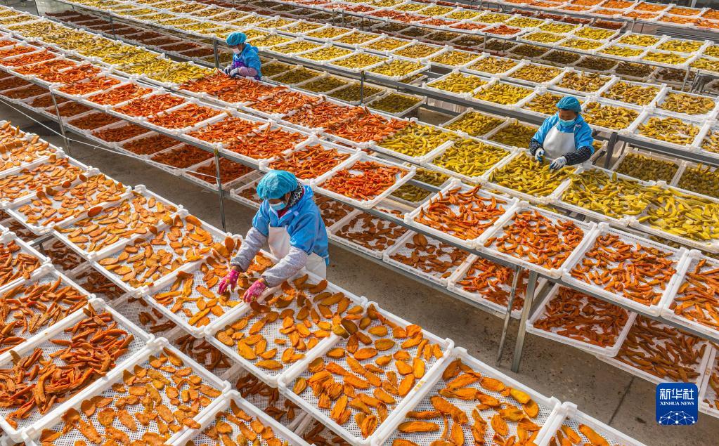 11月19日,工人在晾曬甘薯干(無人機照片)。