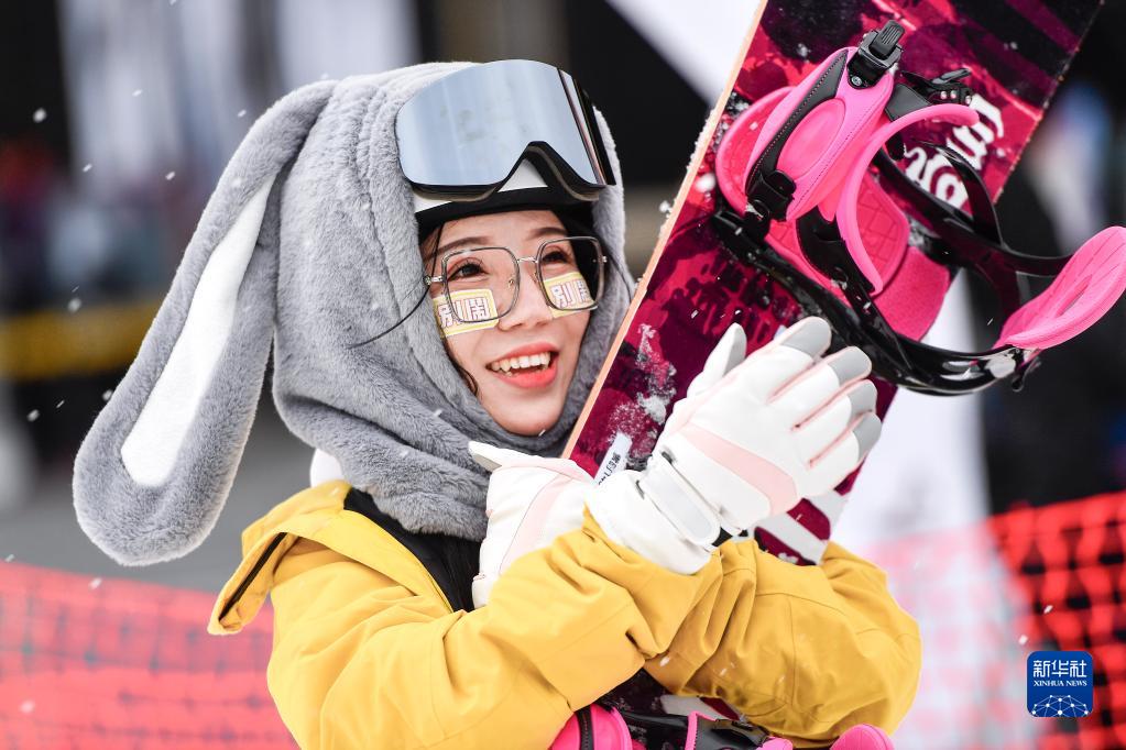 11月19日,滑雪愛好者在萬科松花湖度假區滑雪場抱著滑雪板拍照留念。