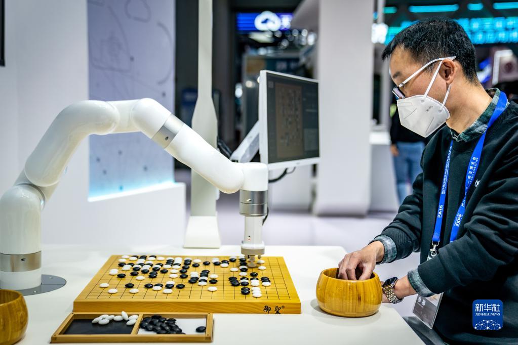 11月19日,在南博會科大訊飛展區,參展商在和弈棋機器人下圍棋。