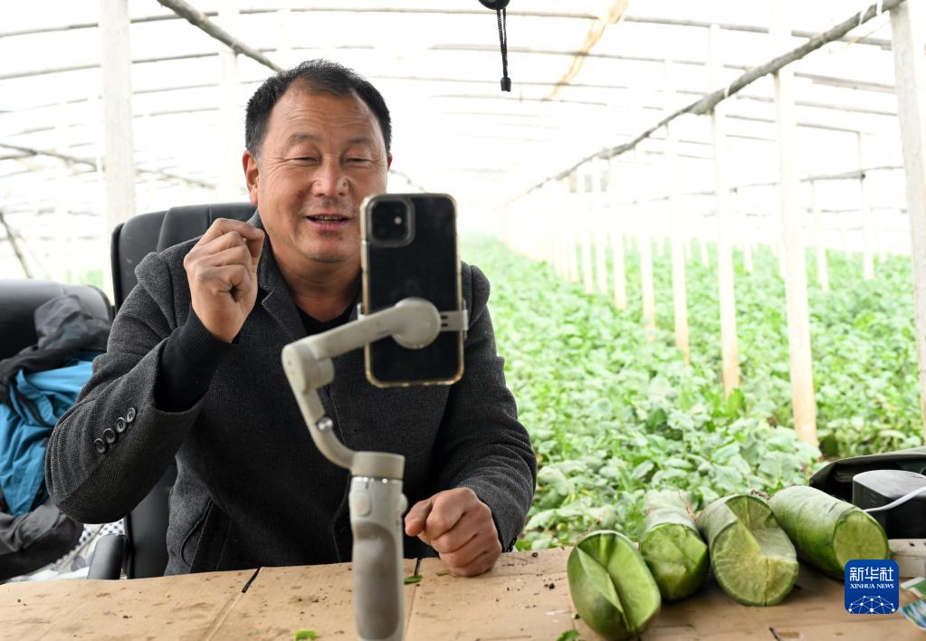 在天津市西青區辛口鎮種植沙窩蘿卜的大棚內,農民郭芝振通過手機直播推介沙窩蘿卜(11月18日攝)。