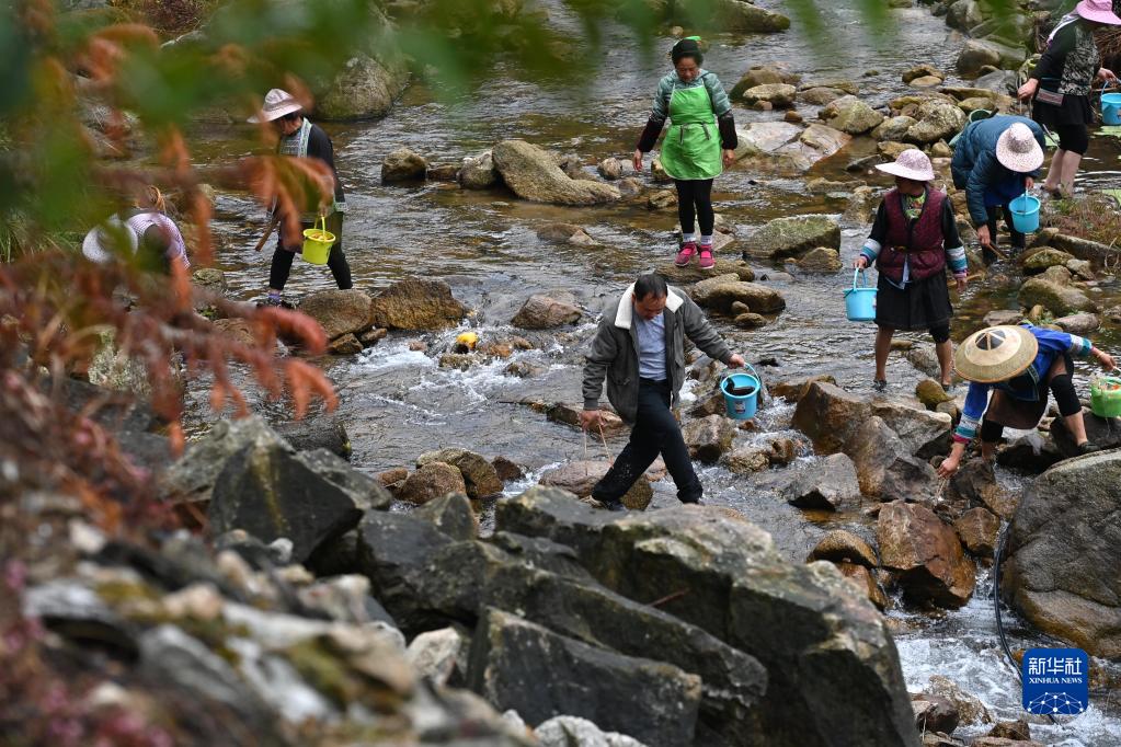 11月19日,在廣西融水苗族自治縣桿洞鄉黨鳩村,河長梁成張(前中)帶著村民清理烏嘎河垃圾。