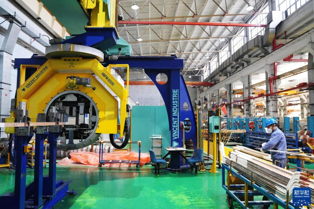 11月17日,在哈電集團哈爾濱電機廠有限責任公司的生產車間,工人在數控自動彎形機旁作業。