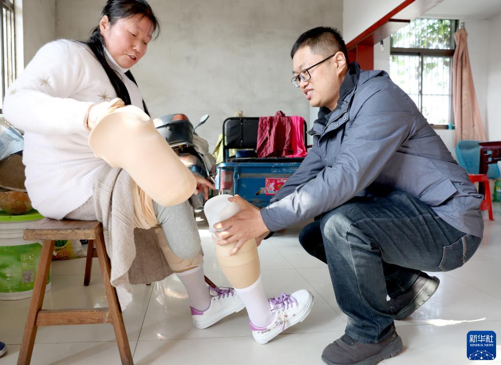 11月15日,泰州市人民醫院醫生孫旭(右)在姚林芳家中為姚林芳檢查假肢安裝情況。姚林芳雙腳從小殘疾,只能匍匐爬行。她在《坡子街》副刊上發表了一篇《誰能說匍匐前行不是前行》的文章,講述四十多年來她和命運抗爭的故事,感動了眾多讀者。泰州市人民醫院主動向她伸出援助之手,免費為她治好了困擾她多年的褥瘡,給她做了雙下肢截肢手術,并安裝了假肢。姚林芳現在已可以借助拐杖直立行走。