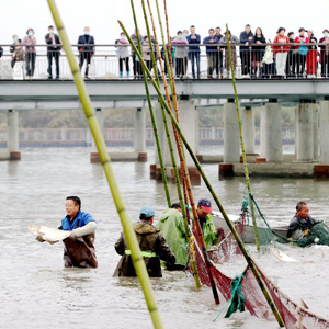 當日,浙江省湖州市德清縣下渚湖舉辦冬捕活動,現場舉行的拉網捕魚、品嘗魚宴、“魚王”競拍等民俗活動,向游人展示了江南水鄉的傳統魚文化。