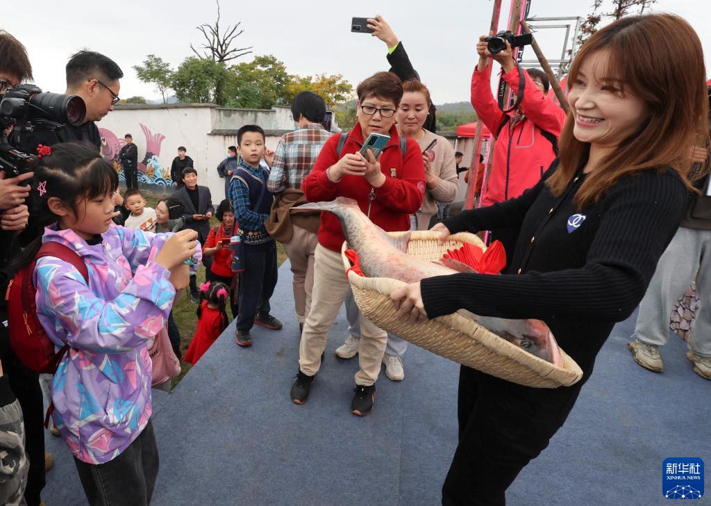 11月19日,游客在活動現場觀賞捕獲的“魚王”。