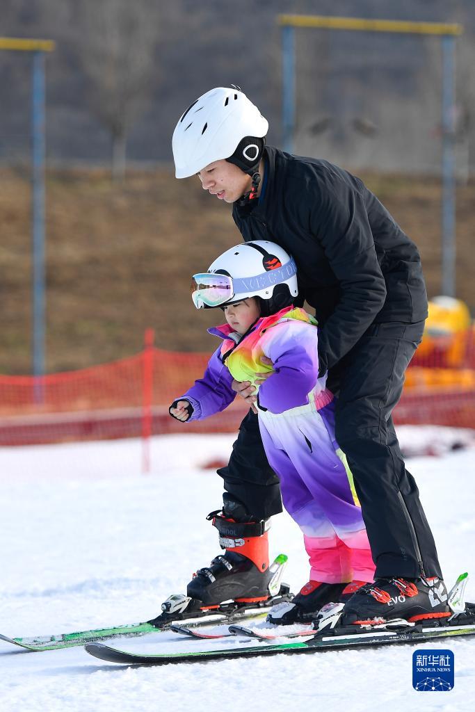 11月20日,在吉林市萬科松花湖度假區,一名小朋友在陪伴下體驗滑雪。