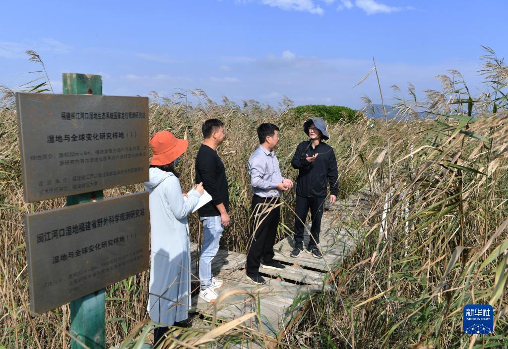 張潮巨(右一)和同事在閩江河口濕地核心區域觀測濕地植被的生長狀況(11月19日攝)。