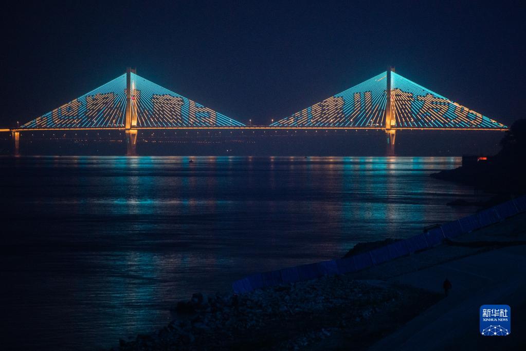 11月20日,湖北武漢長江二橋為世界兒童日亮燈。