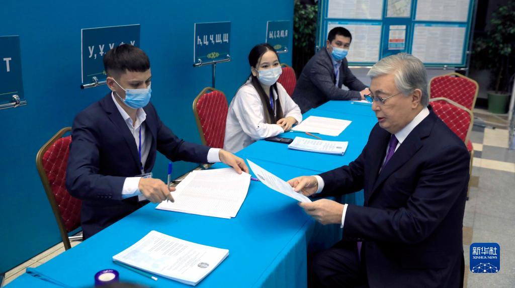 11月20日,哈薩克斯坦總統托卡耶夫在阿斯塔納一處投票站登記投票。