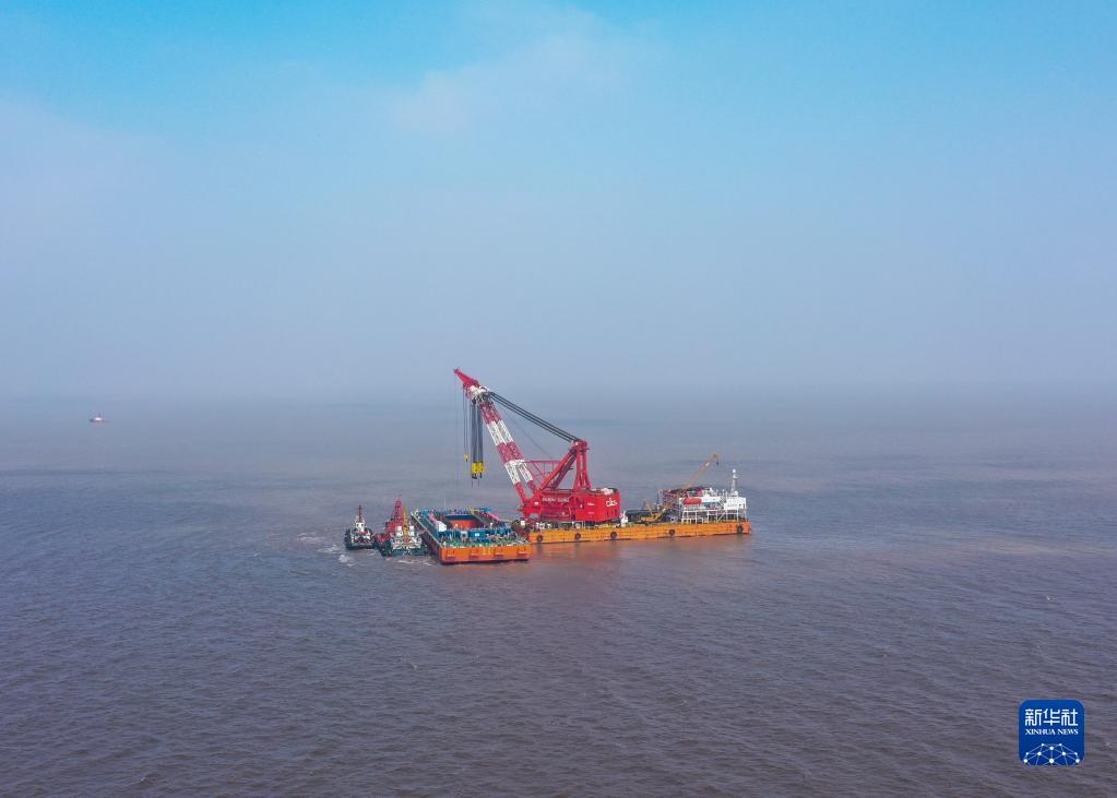 11月20日拍攝的長江口二號古船整體打撈現場(無人機照片)。