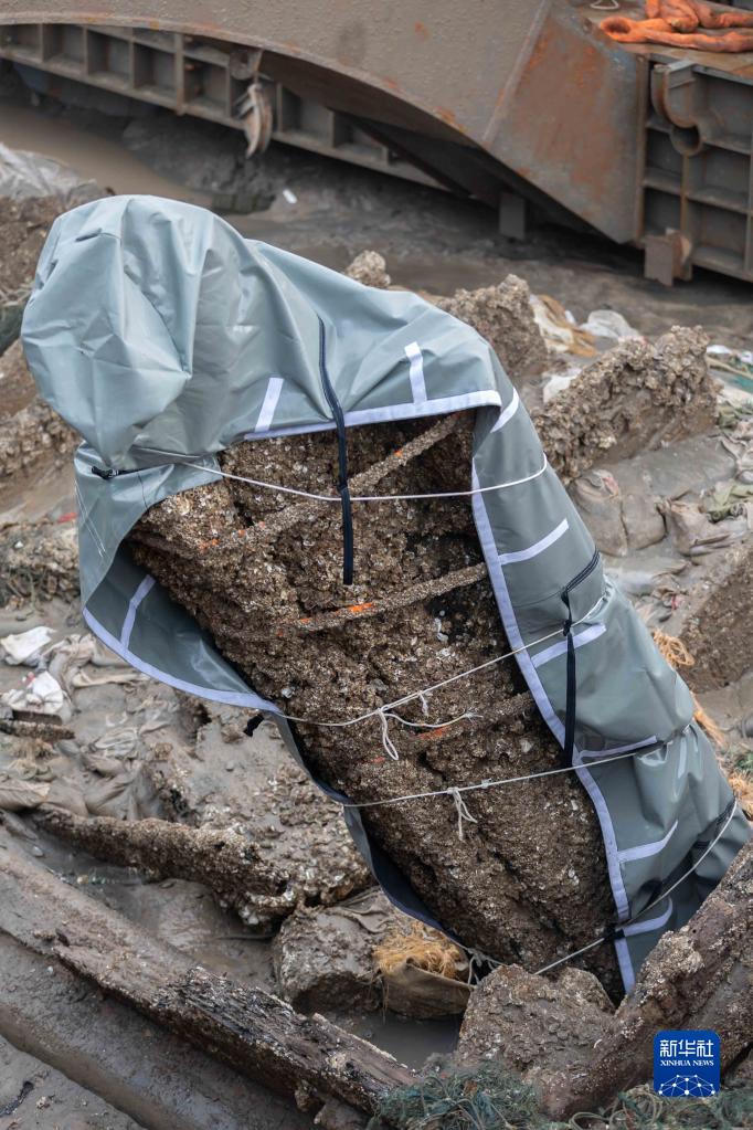 11月21日清晨,工作人員對露出水面的長江口二號古船桅桿做好保護措施。