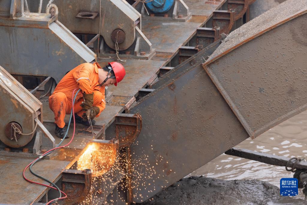 11月21日清晨,工作人員在進行固定古船船體工作。