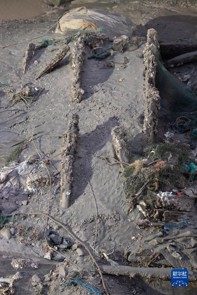 11月21日清晨拍攝的露出水面的古船船體局部。