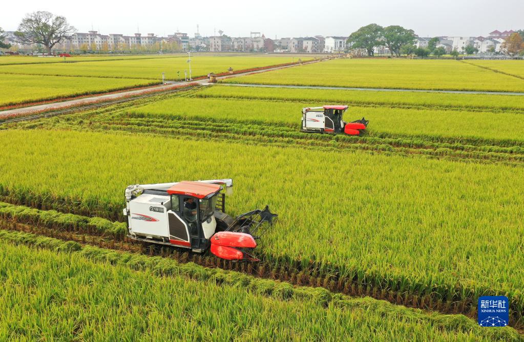 11月21日,收割機在浙江省東陽市城東街道寀盧村共享田園里收割晚稻(無人機照片)。
