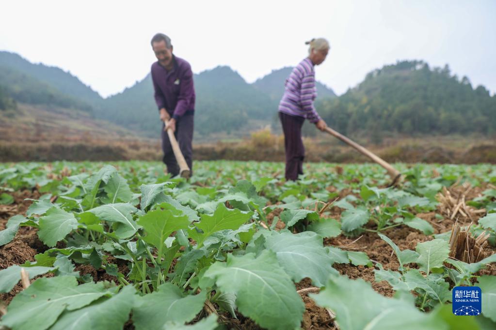 11月20日,村民在貴州省黔東南苗族侗族自治州岑鞏縣大有鎮統口村田間管護油菜。