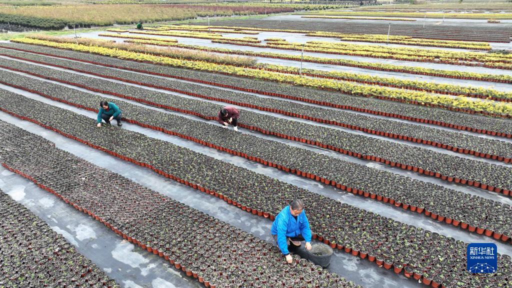 11月20日,在浙江省湖州市德清縣莫干山鎮高峰村千畝苗木種植基地,農民在管護苗木(無人機照片)。
