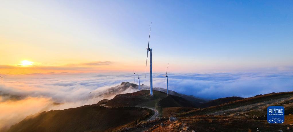 11月20日,在湖南省桂陽縣,風力發電機與云海景觀相互映襯。