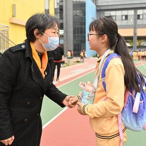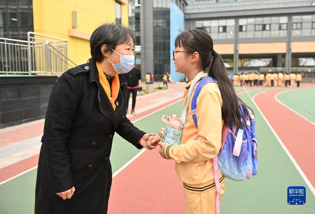 11月18日,在北京第二實驗小學,蘆詠莉與學生握手交流。