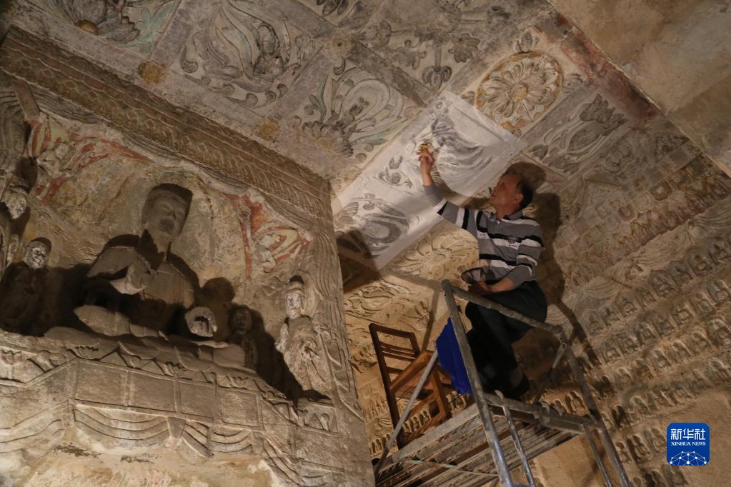 李仁清在鞏義石窟寺進行拓?。ㄙY料照片)。