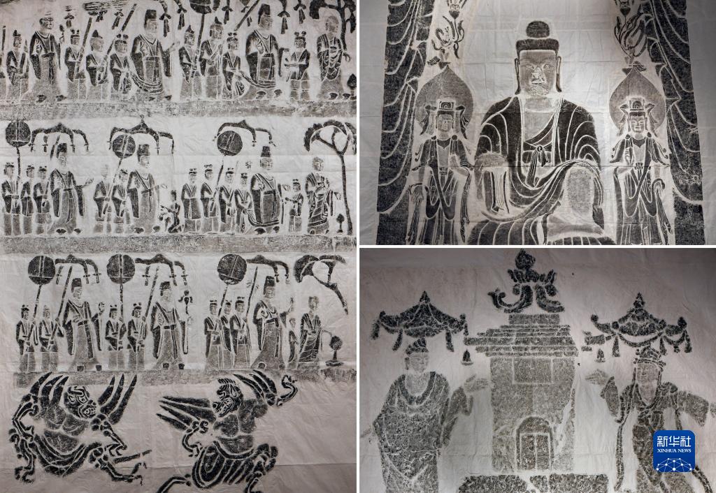 與傳統的平面拓印不同,高浮雕拓印需要將濕透的宣紙沿立體雕像輪廓剪開,直壓在各個部位,因此拓印后的宣紙呈碎片狀,而李仁清則需要把成百上千張的碎片粘接在一起,形成一整幅平面作品。高浮雕傳拓技藝將不可移動文物按1:1的比例轉化為可移動文物,甚至可以將石刻上的裂隙、剝蝕等病害記錄下來,為觀察和保護文物提供準確信息。
