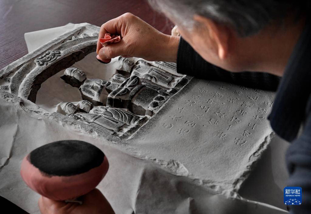 上紙、噴濕、剪紙、砸刷、晾干、撲墨、粘接、修復……一系列流程下來,立體石雕磚上的雕像就纖毫畢現地展露在平面拓片之上,59歲的李仁清拿起拓片仔細地檢查著每一處細節。