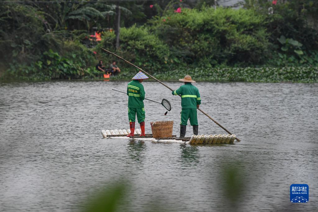 11月20日,市政園林工人在海南省屯昌縣文贊生態濕地公園清理水中垃圾。
