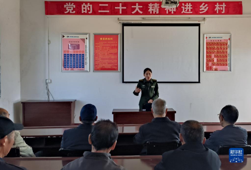 陸軍工程大學“星火”理論宣講服務政治教員群體成員黃貽蘇為湖北省紅安縣中和司村村民宣講黨的二十大精神(2022年11月3日攝)。新華社發(李亞運 攝)