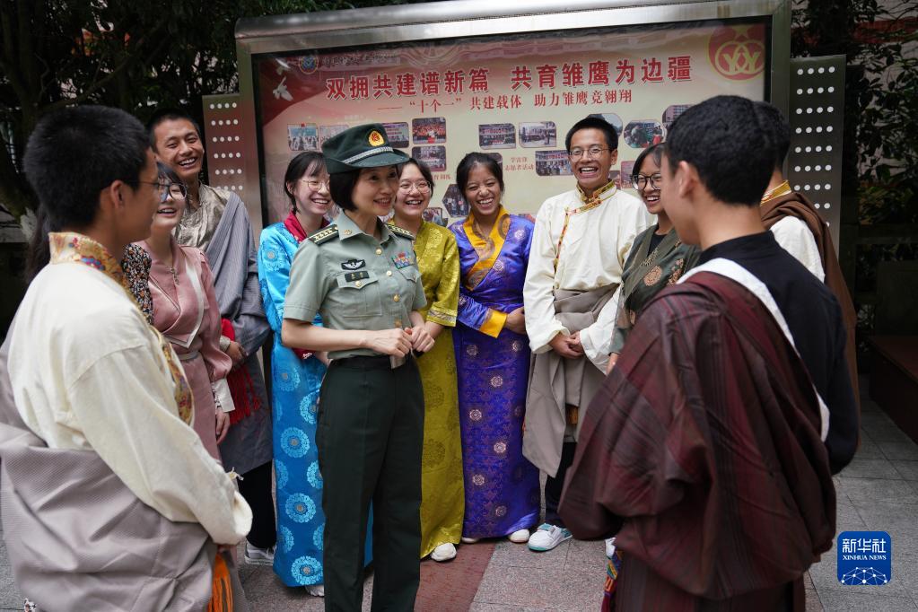 陸軍工程大學“星火”理論宣講服務政治教員群體成員秦潔(中),在重慶西藏中學與藏族學生進行課間討論(2022年6月28日攝)。新華社記者 張永進 攝?