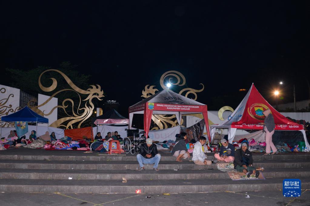 11月22日凌晨,在印度尼西亞西爪哇省展玉地區,受地震影響的人們在戶外休息。