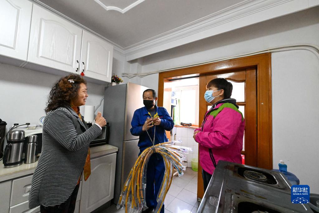 11月22日,在天津市河西區越秀路街道港云里社區,社區黨委副書記、網格員李想(右)入戶查看居民家中燃氣管道更換進展。
