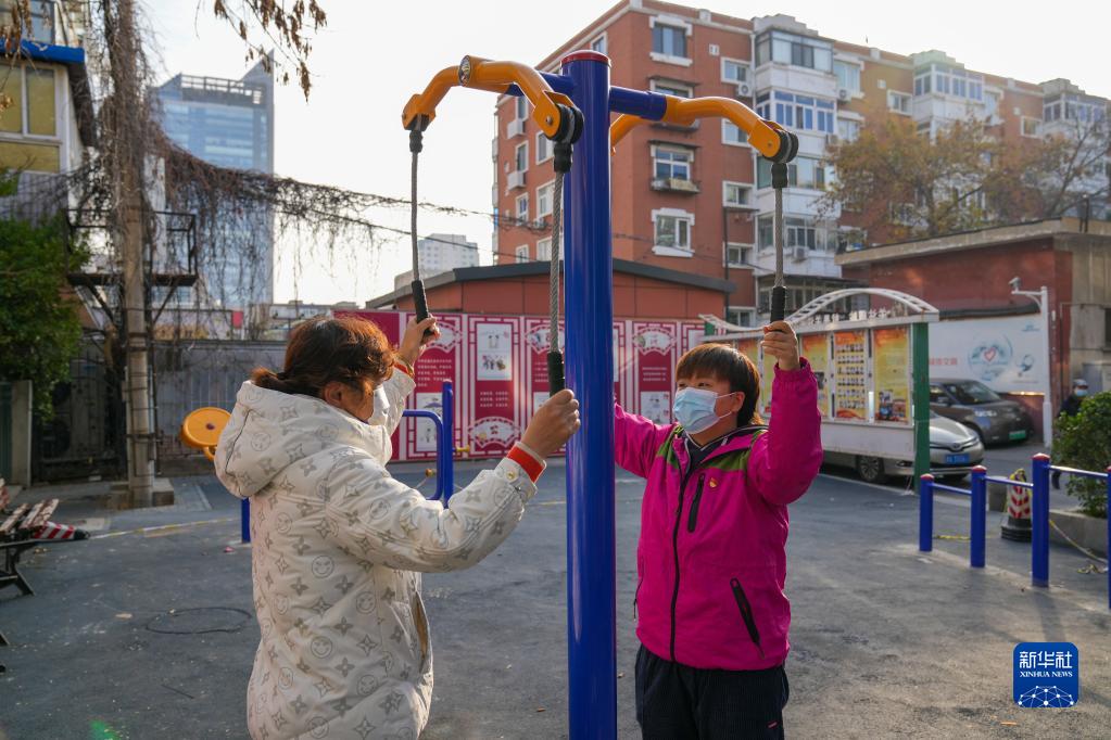 11月22日,在天津市河西區越秀路街道港云里社區,社區黨委副書記、網格員李想(右)在戶外與晨練的居民交流。