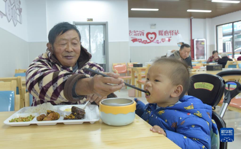 11月22日,安徽省合肥市肥東縣老年助餐服務中心內,老人鄒幫友(左)帶著孫子就餐。