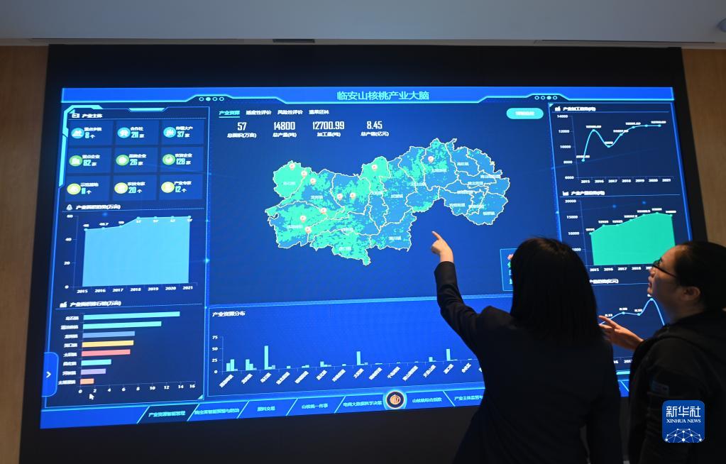 這是11月22日在位于杭州市臨安區龍崗鎮的中國堅果炒貨食品城拍攝的臨安山核桃產業大腦數字化系統,數據涵蓋了臨安當地262家合作社、160家加工廠的山核桃種植、加工、銷售信息。