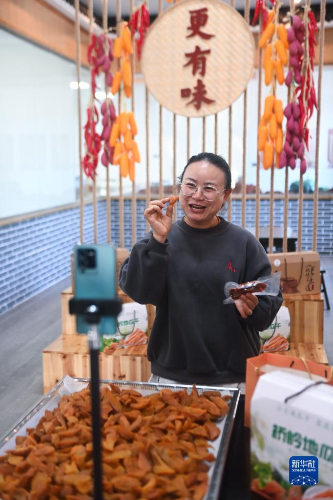 11月23日,黨員志愿者在浙江省建德市更樓街道橋嶺村共富工坊的直播間里進行網上直播銷售地瓜干。