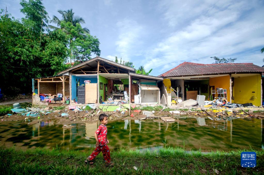 11月23日,在印度尼西亞西爪哇省展玉地區的地震災區,一名兒童從受損房屋旁走過。