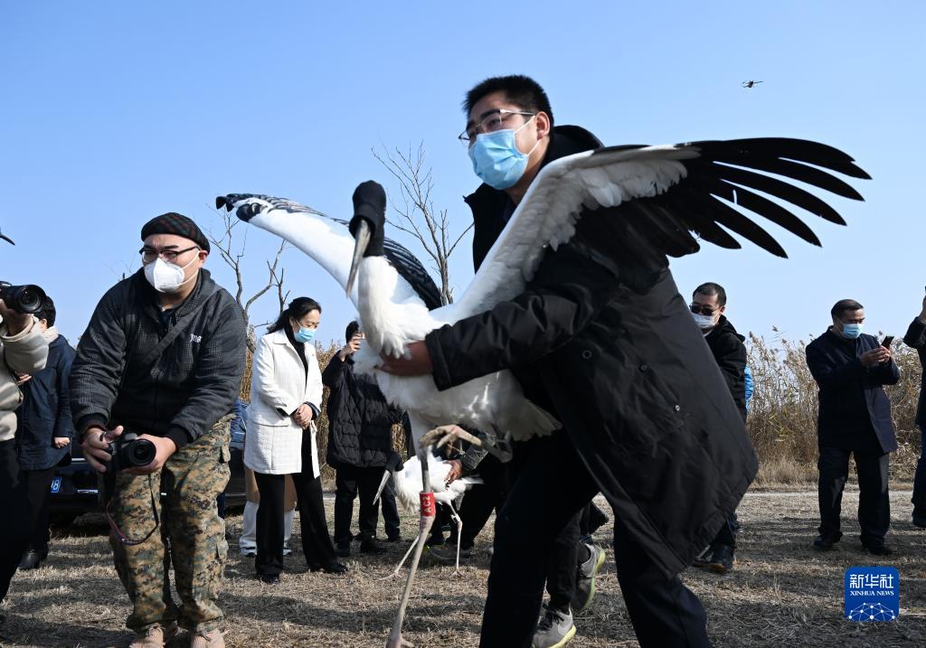 當日,天津市寧河區林業局將3只具有野外生存能力的東方白鸛在七里海濕地放歸自然。