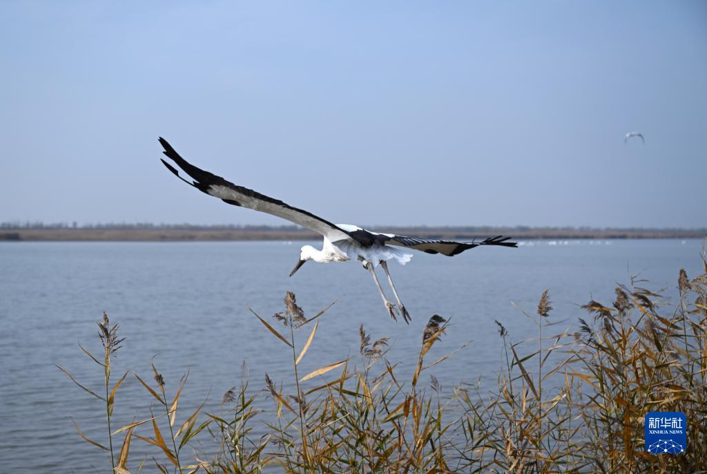 11月23日,被救助的一只東方白鸛在七里海濕地起飛。