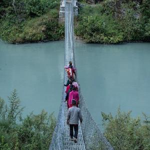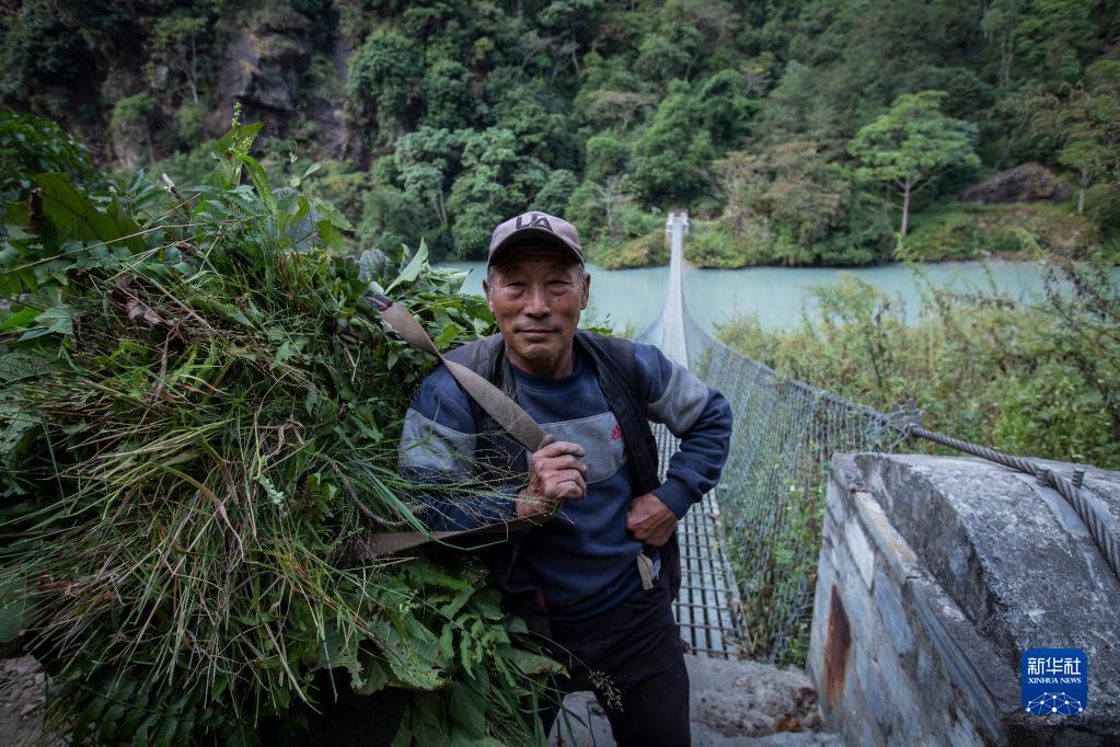 11月8日,在尼泊爾勒姆宗縣,村民走過水電站項目公司幫助修繕的吊橋。