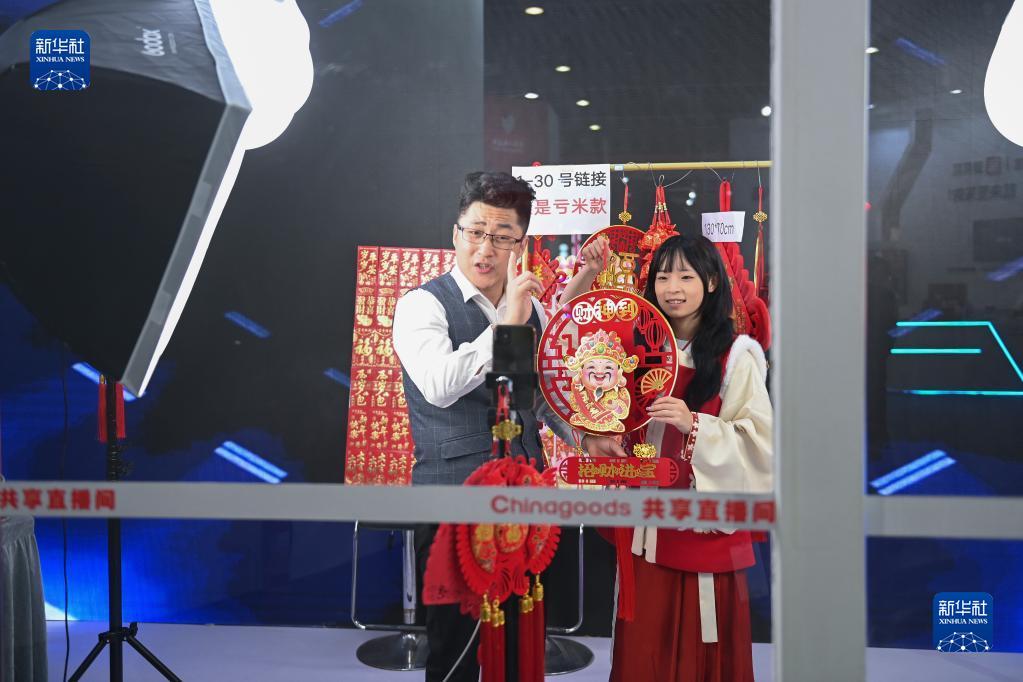 11月24日,參展商在義烏市場建設40周年主題館的“共享直播間”展區進行直播帶貨。