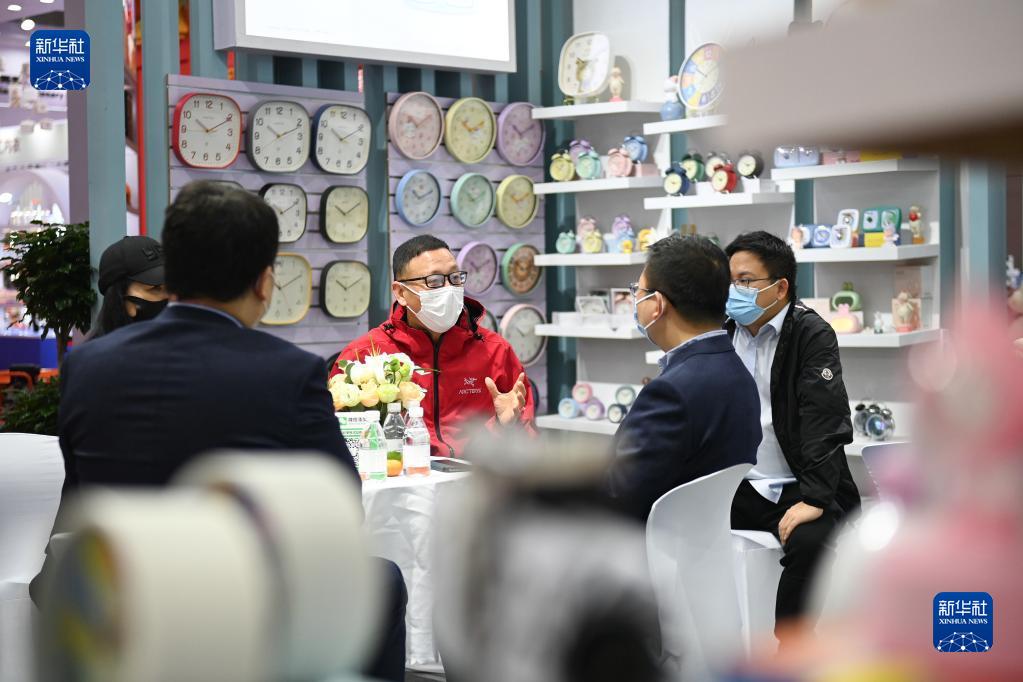 11月24日,客商在義烏市場建設40周年主題館的一個展區洽談。