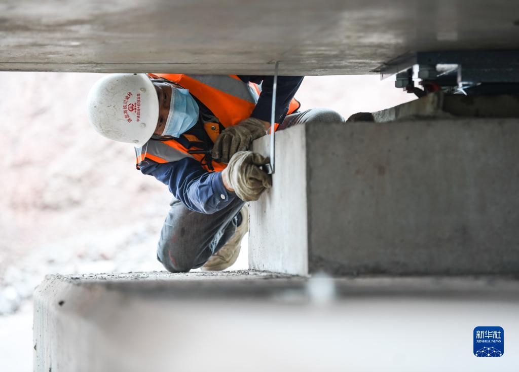 11月24日,在渝昆高鐵瀘宜段架梁施工現場,施工人員在校對箱梁墊石標高。