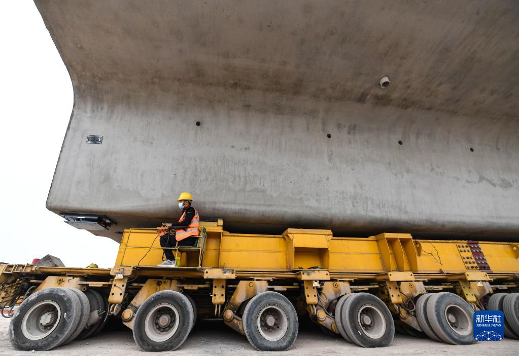 11月24日,在渝昆高鐵瀘宜段架梁施工現場,施工人員操作架梁車運送箱梁。