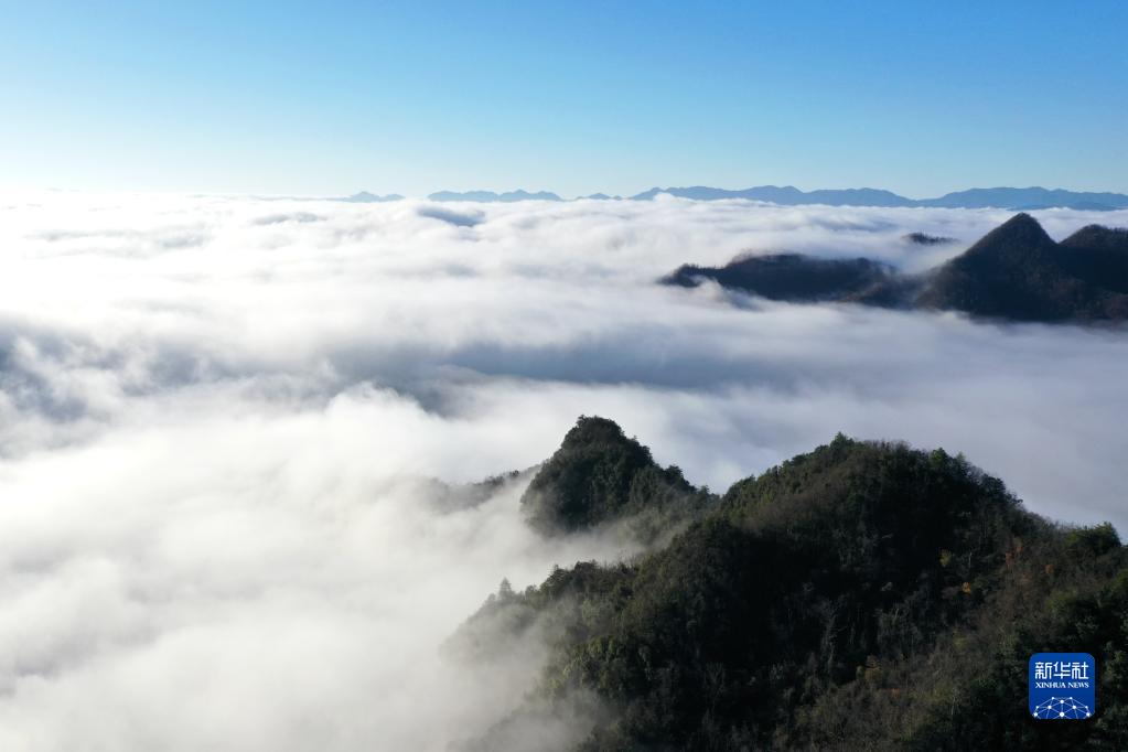 11月24日在湖北省襄陽市??悼h馬橋鎮梨花山拍攝的云海(無人機照片)。