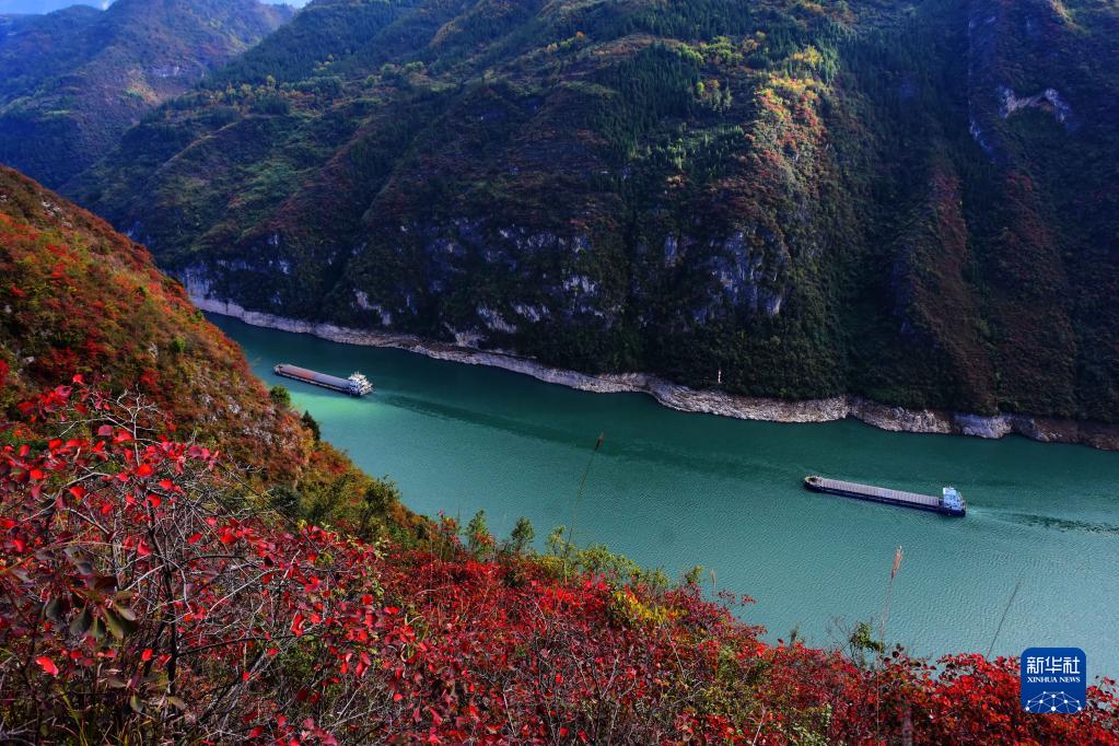 11月24日,輪船航行在紅葉映襯下的長江巫峽水域。