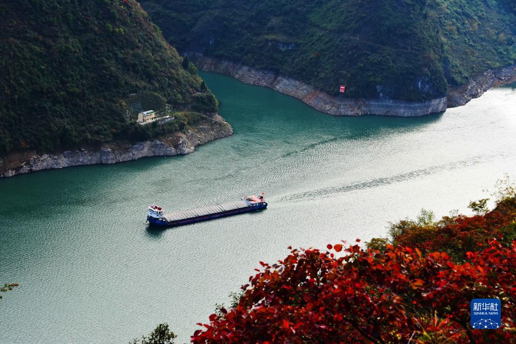 11月24日,輪船航行在紅葉映襯下的長江巫峽水域。