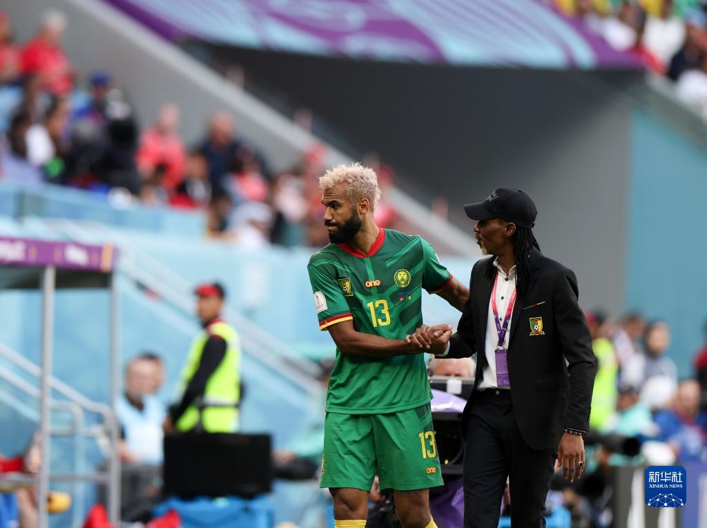 11月24日,喀麥隆隊主教練里格貝特·宋(右)與被替換下場的球員舒波-莫廷交流。