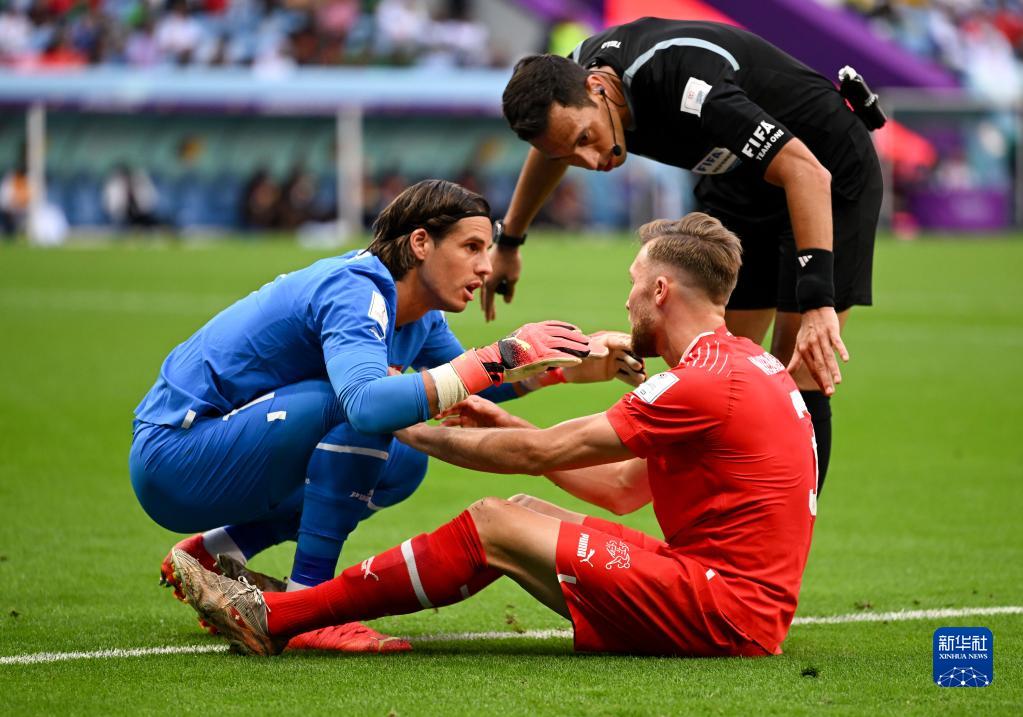 11月24日,瑞士隊守門員索默(左)查看隊友西爾萬·威德默。