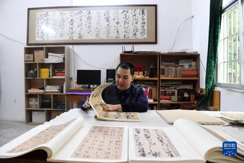 11月24日,在都安瑤族自治縣大興鎮九頓村那內屯家里,王金寶在研究字帖。