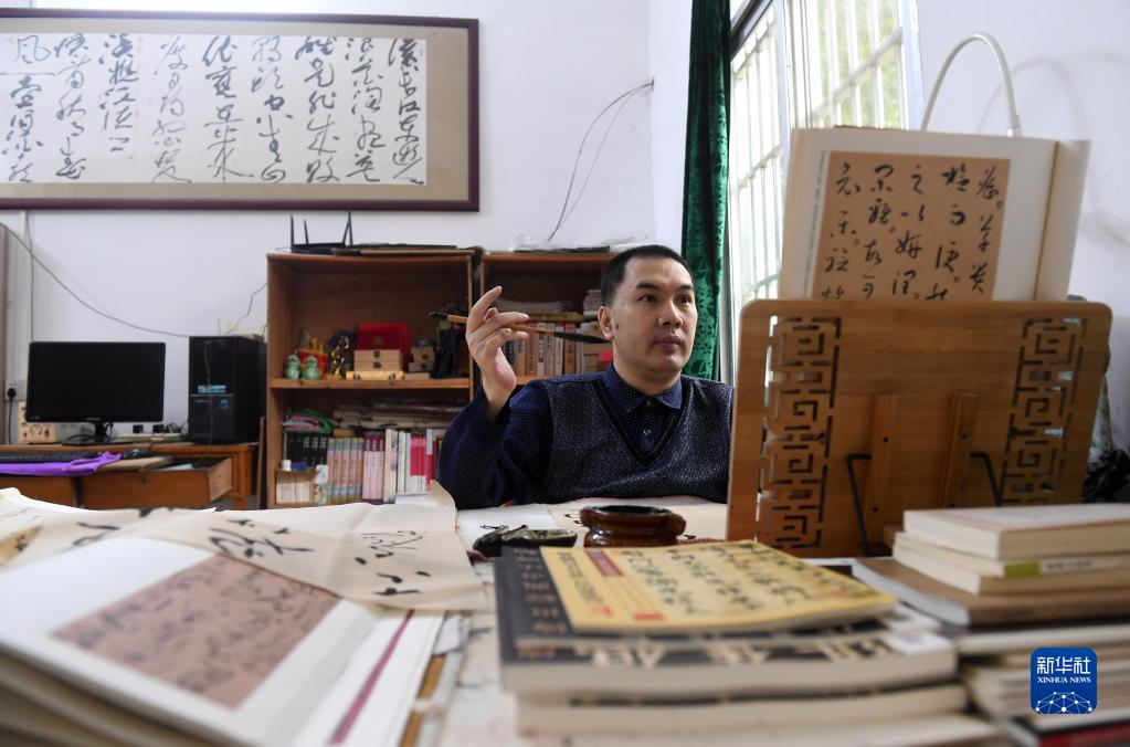 11月24日,在都安瑤族自治縣大興鎮九頓村那內屯家里,王金寶在研究字帖。