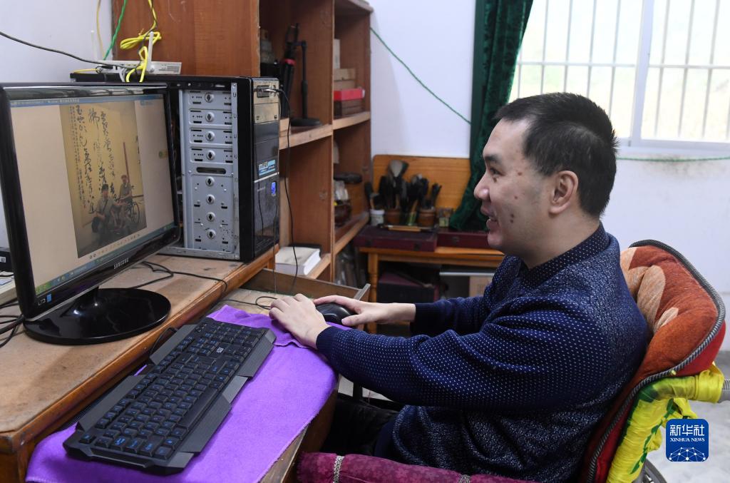 11月24日,在都安瑤族自治縣大興鎮九頓村那內屯家里,王金寶用電腦查閱有關資料。